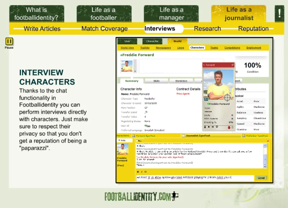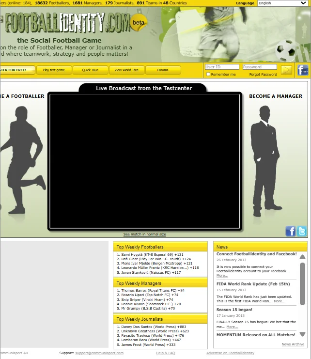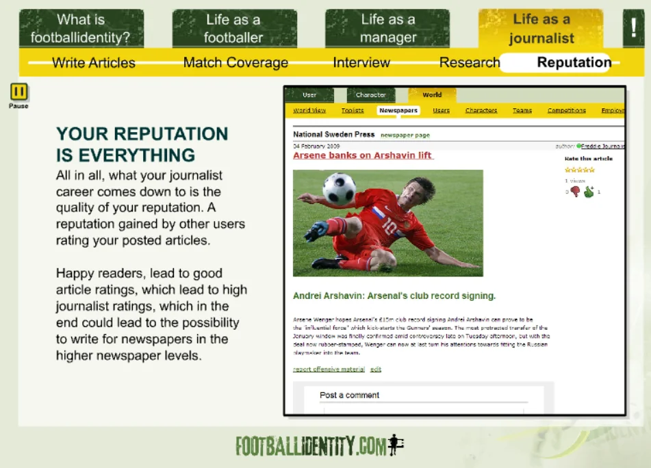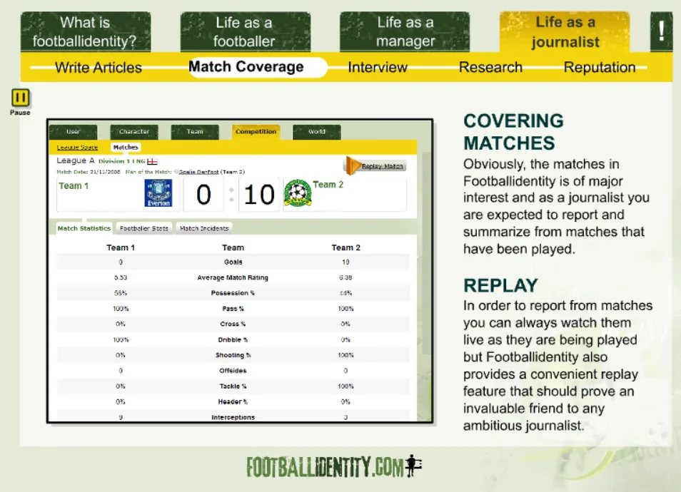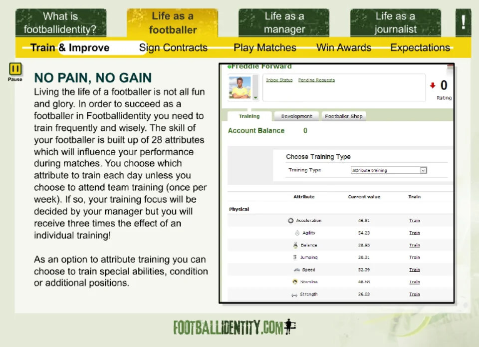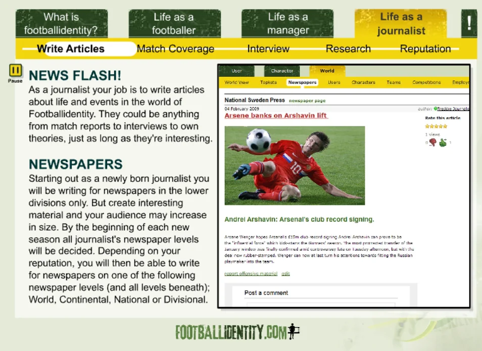 Footballidentity was a browser-based football MMO that allowed players to create their own footballer and live an entire career — from local pitches to packed stadiums.